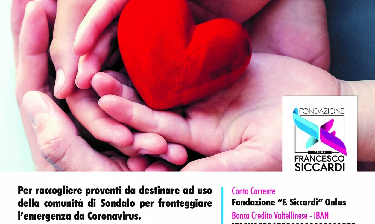 In questo momento delicato la Fondazione F. Siccardi - Onlus ha deciso di farsi “parte attiva” e di attivare, d’intesa con il Comune di Sondalo, un Fondo Speciale di Solidarietà “Obiettivo Sondalo Solidale” per raccogliere proventi da destinare ad uso della comunità di Sondalo e per rispondere alle richieste interne alla RSA Bellavista. Potrà essere utilizzato altresì per potenziare nuovi progetti di collaborazione e sinergia tra la RSA e le agenzie ricreative presenti sul Territorio (CAG, Biblioteca, associazioni, Comunità Pastorale etc.).